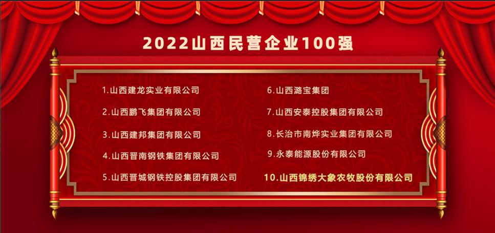 本次在2022山西省民营企业100强中排名第十,是集团自2018年(第十名)、2020年(第九名)、2021年(第十名)后第四次进入全省民营企业百强榜单前十名,是集团顺应时代发展大势,乘势而上,主动担当作为的奋斗成果,是数万名“大象人”牢记领袖嘱托,实干创业,大力弘扬企业家精神的生动体现。